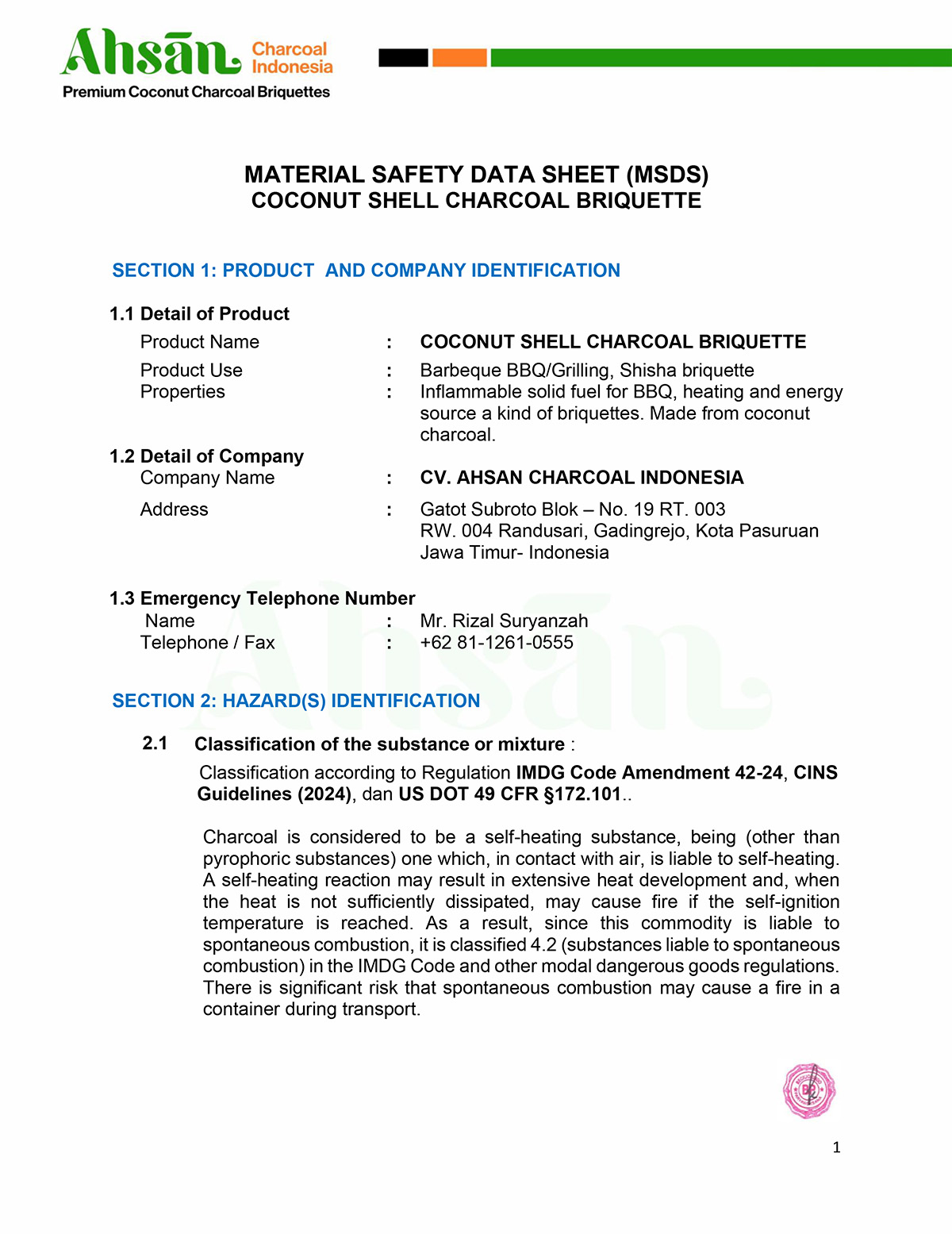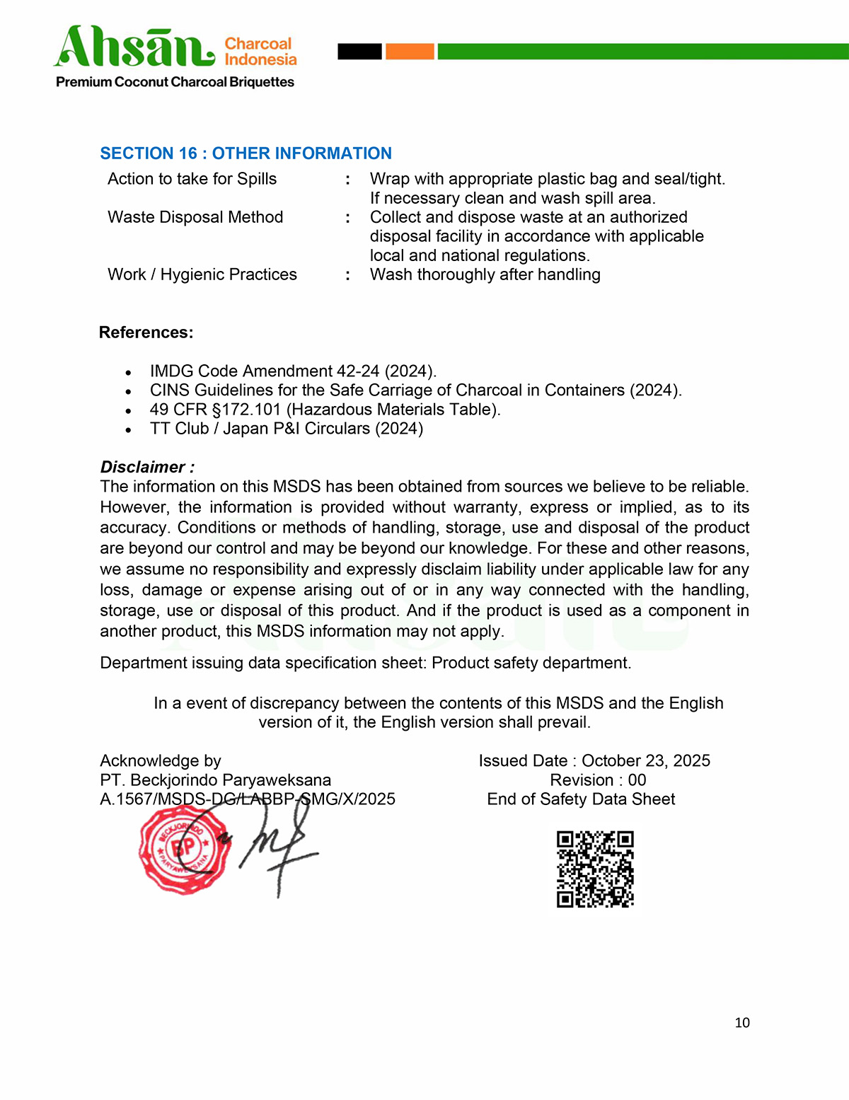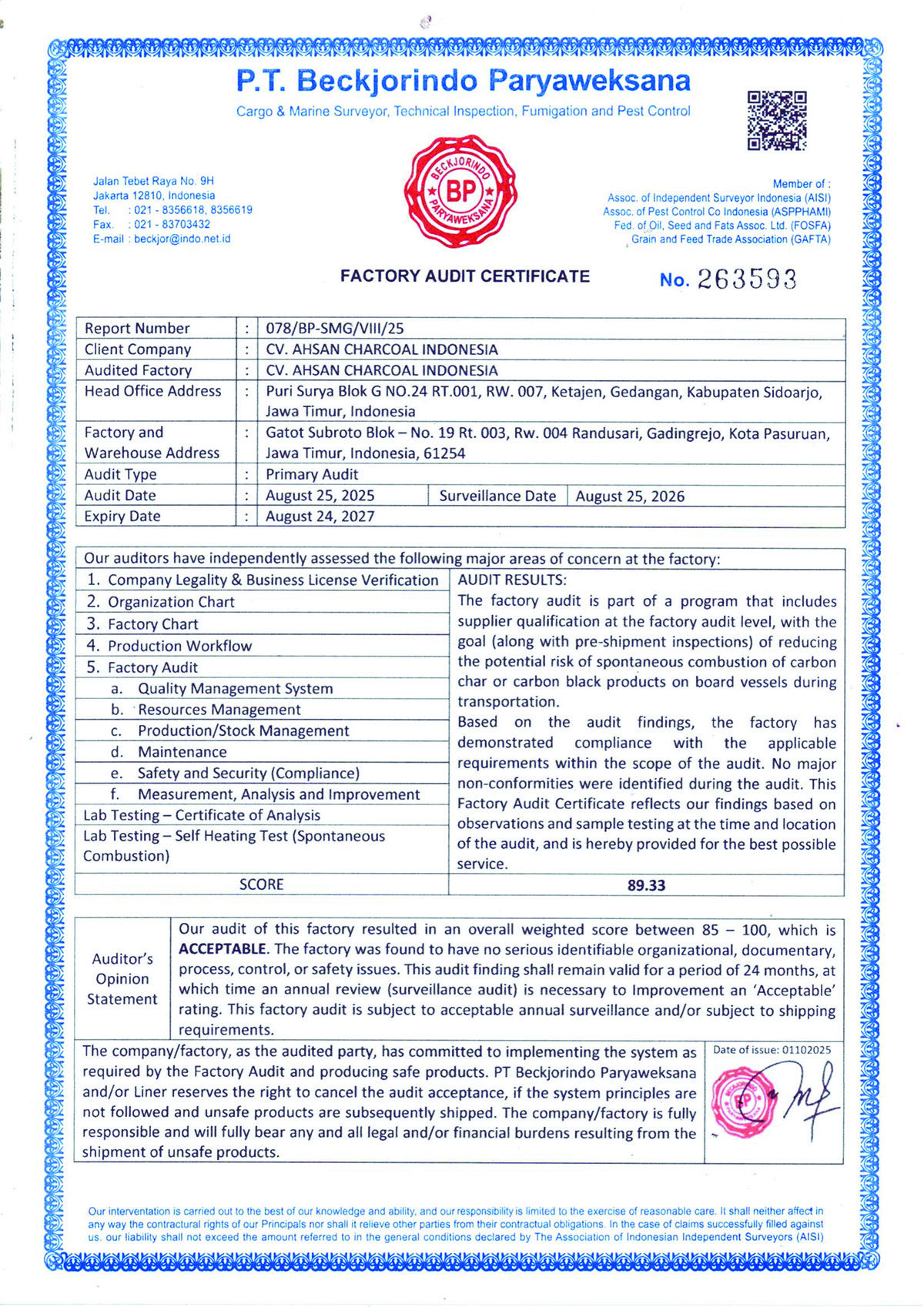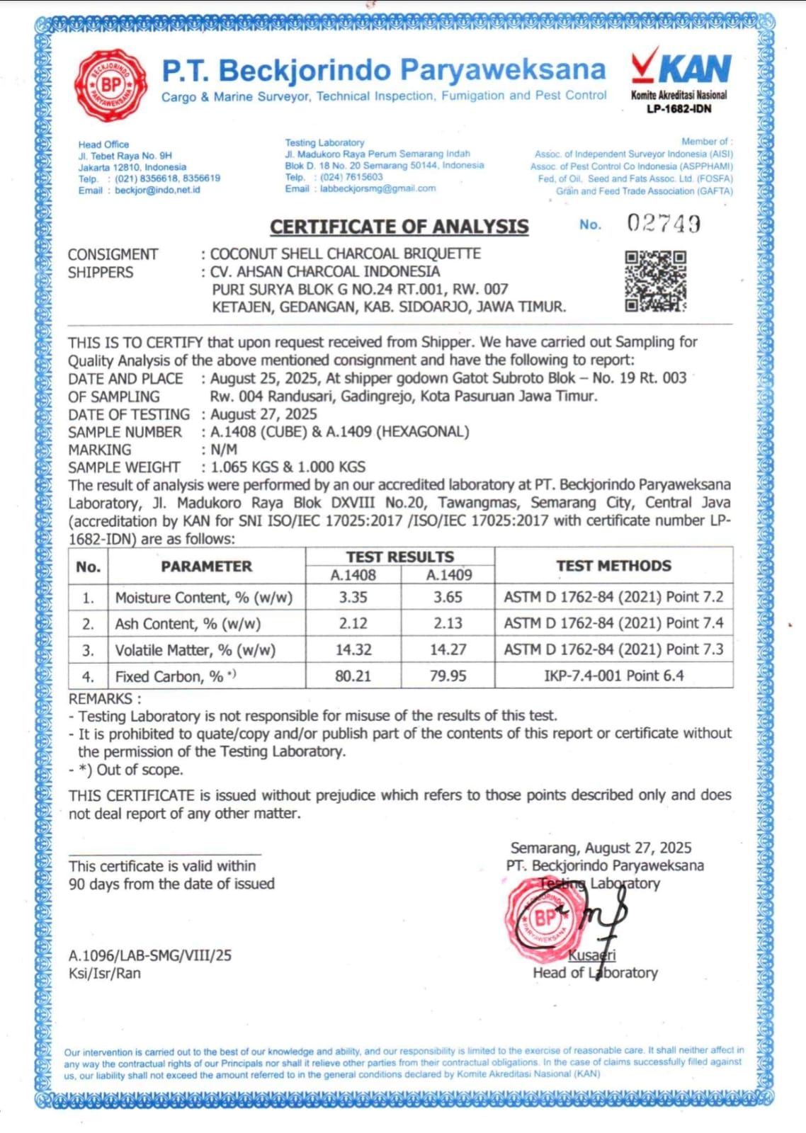 Our products have been officially audited and tested by PT Beckjorindo Paryaweksana, ensuring that our coconut shell charcoal briquettes comply with international quality standards.